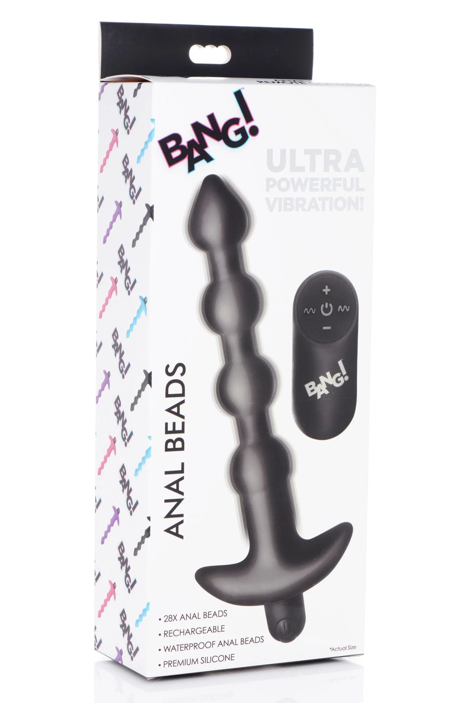 Verwen je achterste met de krachtige BANG! 28X Vibrerende Silicone Anaalkralen! Deze fluweelzachte en flexibele kralen zorgen voor comfortabel anaal plezier, perfect voor zowel beginners als ervaren gebruikers. Dankzij de taps toelopende punt verloopt de penetratie soepel, terwijl de brede basis voorkomt dat de kralen te diep worden ingebracht. Bestuur de vibraties eenvoudig met de knop op het product of gebruik de draadloze afstandsbediening. Kies uit 4 snelheden en 7 vibratiepatronen om elke kraal intens te laten trillen! De krachtige motor in de bullet-vibrator is oplaadbaar via de meegeleverde USB-kabel voor eindeloos plezier. Gebruik je favoriete glijmiddel op waterbasis voor een nog aangenamere ervaring. De BANG! kralen zijn ideaal voor anale training, spannende masturbatiesessies of speelse stelletjes die een extra buzz willen tijdens hun avonturen. Dankzij het IPX7-waterdichte ontwerp zijn deze kralen perfect voor plezier onder de douche én gemakkelijk schoon te maken met warm water en milde zeep. Afmetingen: Totale lengte zonder bullet: 19 cm, Inbrengbare lengte: 16,5 cm, Maximaal inbrengbare diameter: 2,8 cm. Bullet: 7,6 cm lang, 2 cm breed. Materiaal: Silicone, ABS-plastic Kleur: Zwart