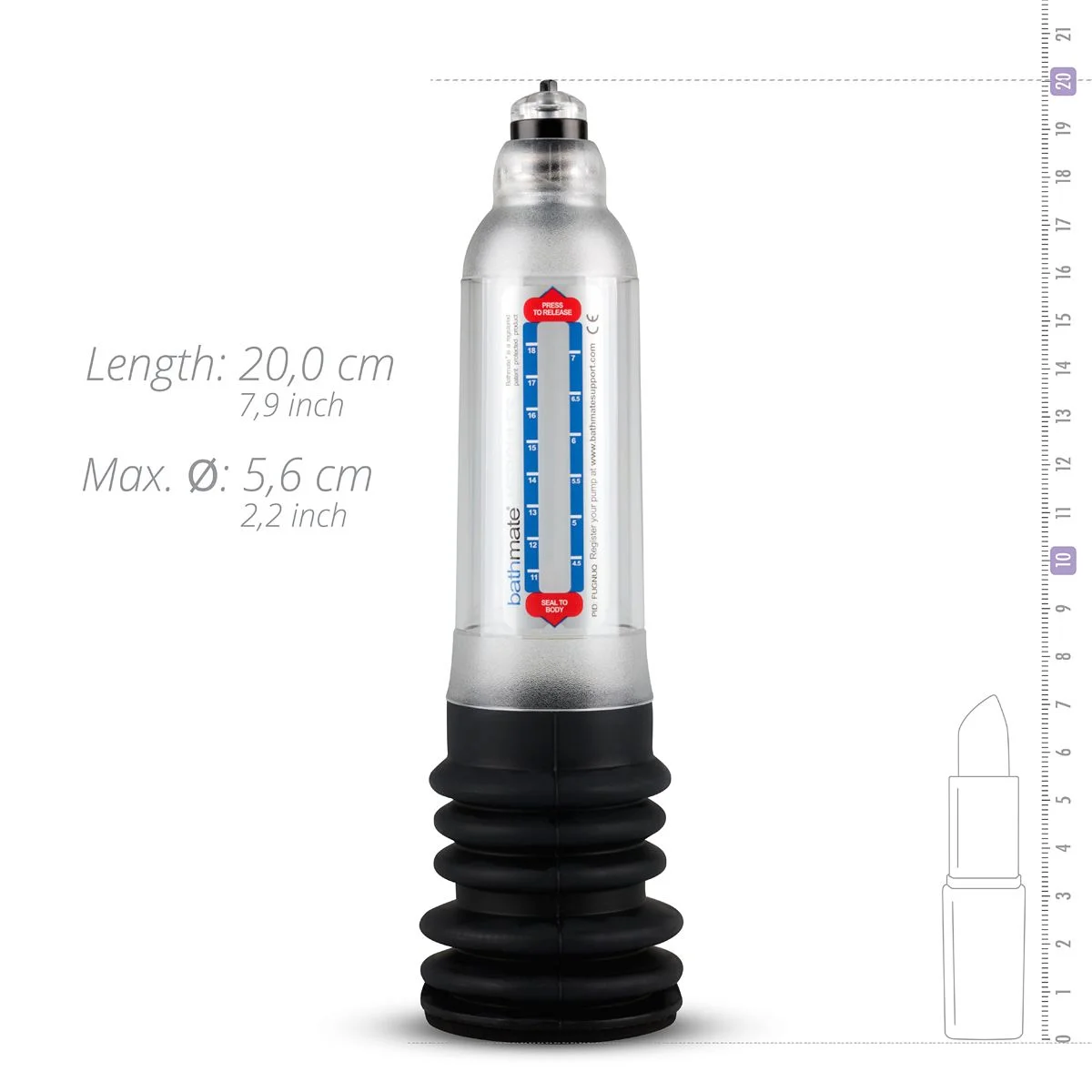 De Bathmate Hydro 7 Penispomp is een hydrotherapie pomp voor maximale penisvergroting! Je kunt deze penispomp gebruiken in bad of onder de douche en vullen met warm water. Door het creëren van een verhoogde bloedcirculatie zal deze penispomp jouw penis optimaal vergroten. Als je deze vult met warm water zal de penis nog groter en harder worden. Hoe meer je de penispomp gebruikt  hoe sterker, groter en gezonder jouw penis zal gaan worden. Het resultaat is al zichtbaar na 1 sessie. Het is aangeraden om de penispomp maximaal 3 keer per week te gebruiken voor maximaal 20 minuten. De Hydro 7 penispomp is geschikt voor een erecte penis met een lengte van 13 tot 18 cm.