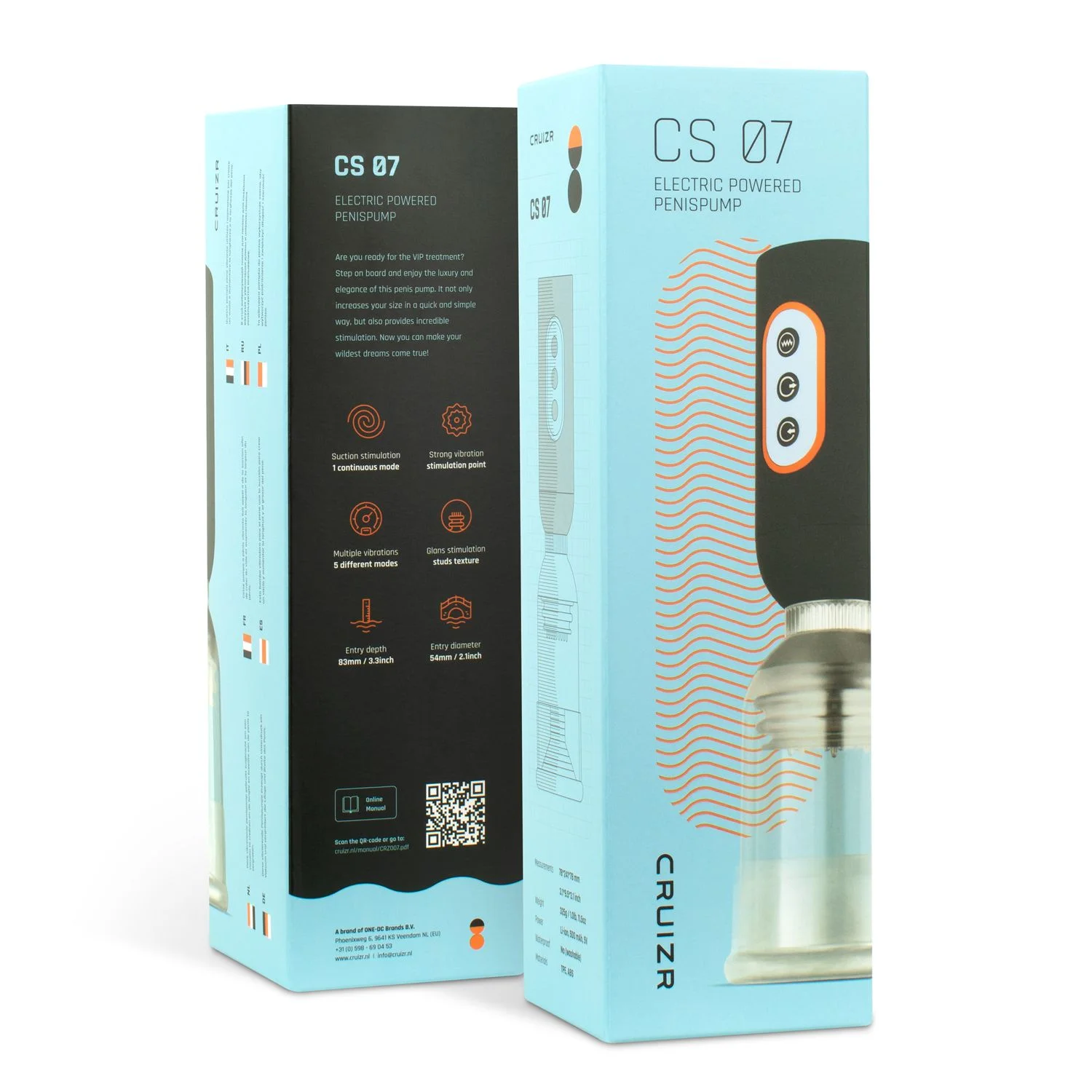 De CRUIZR CS07 is een luxe penispomp met 5 vibrerende en een zuigende functie. De penispomp stimuleert de doorbloeding naar de penis en zorgt er voor dat jouw penis aanzienlijk in volume toeneemt. Tegelijkertijd geniet je van een heerlijke intense stimulatie. Deze pomp is voorzien van een doorzichtige koker zodat je goed zicht hebt op het gewenste resultaat. Gebruik een beetje glijmiddel op waterbasis voor een comfortabel gevoel. De penispomp wordt inclusief een USB-kabel geleverd. Laad de pomp voor het eerste gebruik volledig op. Gebruik de CRUIZR CS07 als voorspel samen met jouw partner of geniet solo van een unieke beleving. De manual download je snel en makkelijk via de QR code op de verpakking. Reinig de pomp met lauwwarm water en toycleaner. Dompel de pomp niet volledig onder water want dit kan de elektronica beschadigen.