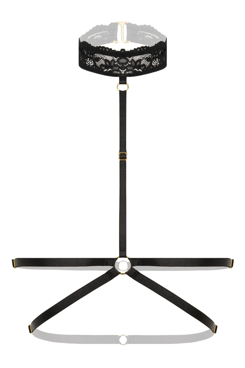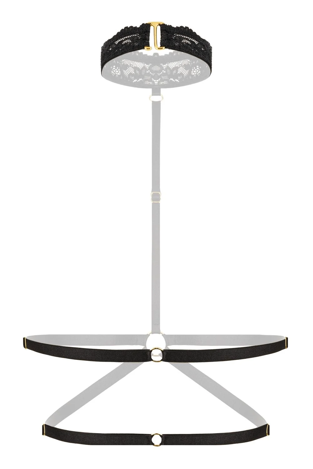 Stijlvolle Harnas bralette, ontworpen voor zowel over als onder kleding, biedt deze accessoires een mix van sensualiteit en casual chic, waarmee je moeiteloos je dagelijkse look of je momenten onder de lakens verrijkt. Dit accessoire is niet alleen een mode-statement, maar ook een uitdrukking van individualiteit en zelfvertrouwen.  Gemaakt van zachte, elastische bandjes met goudkleurige accessoires en kanten details.