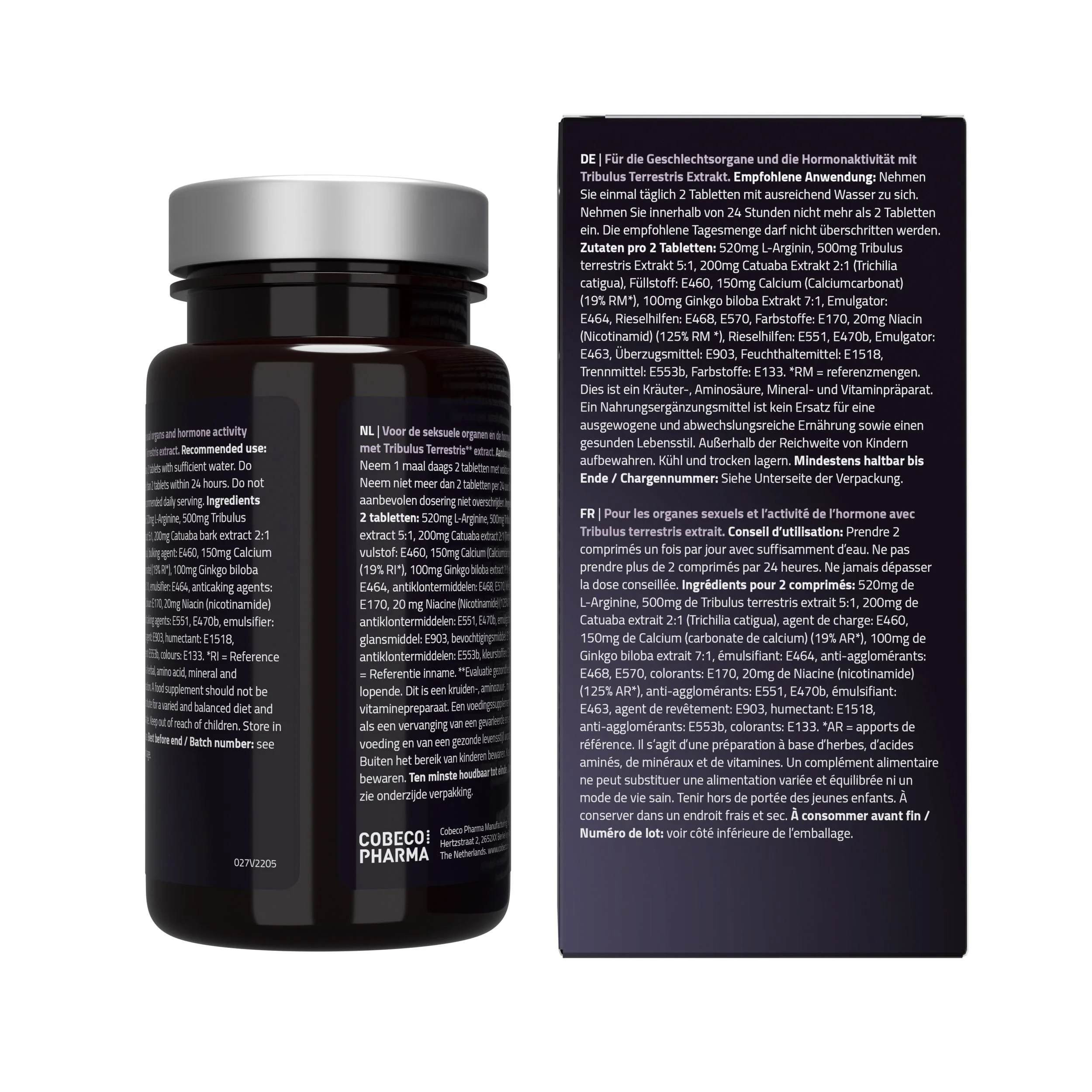 Verbeter je prestatievermogen en verhoog je potentie met deze potentieverhogende pillen. Op een natuurlijke manier stimuleert jij je geslachtsdrift en voel je je seksuele kracht toenemen. Daarnaast zal je je met de dag vitaler gaan voelen. Versterk op alle fronten je potentie met deze potentie pillen. Aanbevolen dosering niet overschrijden. Een gevarieerd, evenwichtige voeding en een gezonde levensstijl zijn belangrijk. Een voedingssupplement is geen vervanging van een gevarieerde voeding. Buiten bereik van kinderen houden. Raadpleeg een deskundige alvorens supplementen te gebruiken in geval van zwangerschap, lactatie, medicijngebruik en ziekte. Ingrediënten per 2 tabletten: 520 mg L-Arginine, vulstof: E460, 200 mg Catuaba extract 2:1 (Trichilia catigua), 150 mg Calcium (Calciumcarbonaat) (19% ADH*), 100 mg Ginkgo biloba extract 50:1, 100 mg Tribulus terrestris extract 6:1, antiklontermiddelen: E468, E570, 20 mg Niacine (Nicotinamide) (125% ADH*), antiklontermiddelen: E551, E470b, emulgator: E464, bevochtigingsmiddel: E1518, kleurstof: E171, kleurstof: E133.