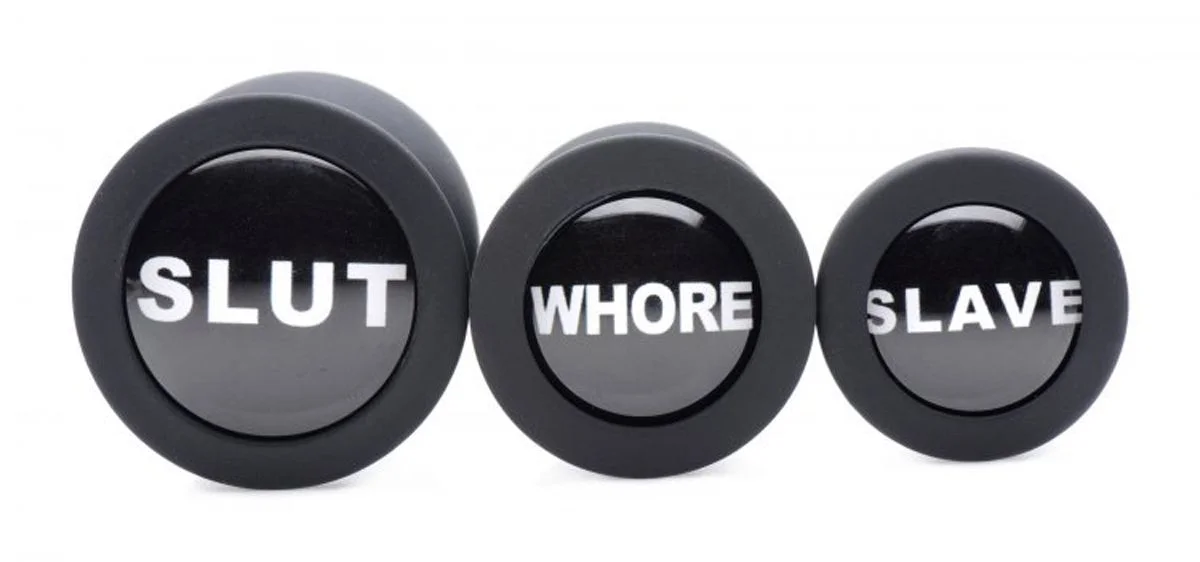 Deze buttplug set heeft drie groottes met taps toelopende punten. Op de onderzijde van elke buttplug staat een Dirty Word zoals 'Slut', 'Whore' of 'Slave'. Geef met de buttplug aan hoe je gemoedstoestand is of in wat voor soort spel jij zin hebt. Ze zijn gemakkelijk in te brengen en eenvoudig schoon te maken. "Slave" Lengte: 7,4 cm Invoerdiepte: 6 cm Max. diameter: 2,5 cm "Whore" Lengte: 8,4 cm Invoerdiepte: 7 cm Max. diameter: 3,4 cm "Slut" Lengte: 9,7 cm Invoerdiepte: 8,4 cm Max. diameter: 4,2 cm