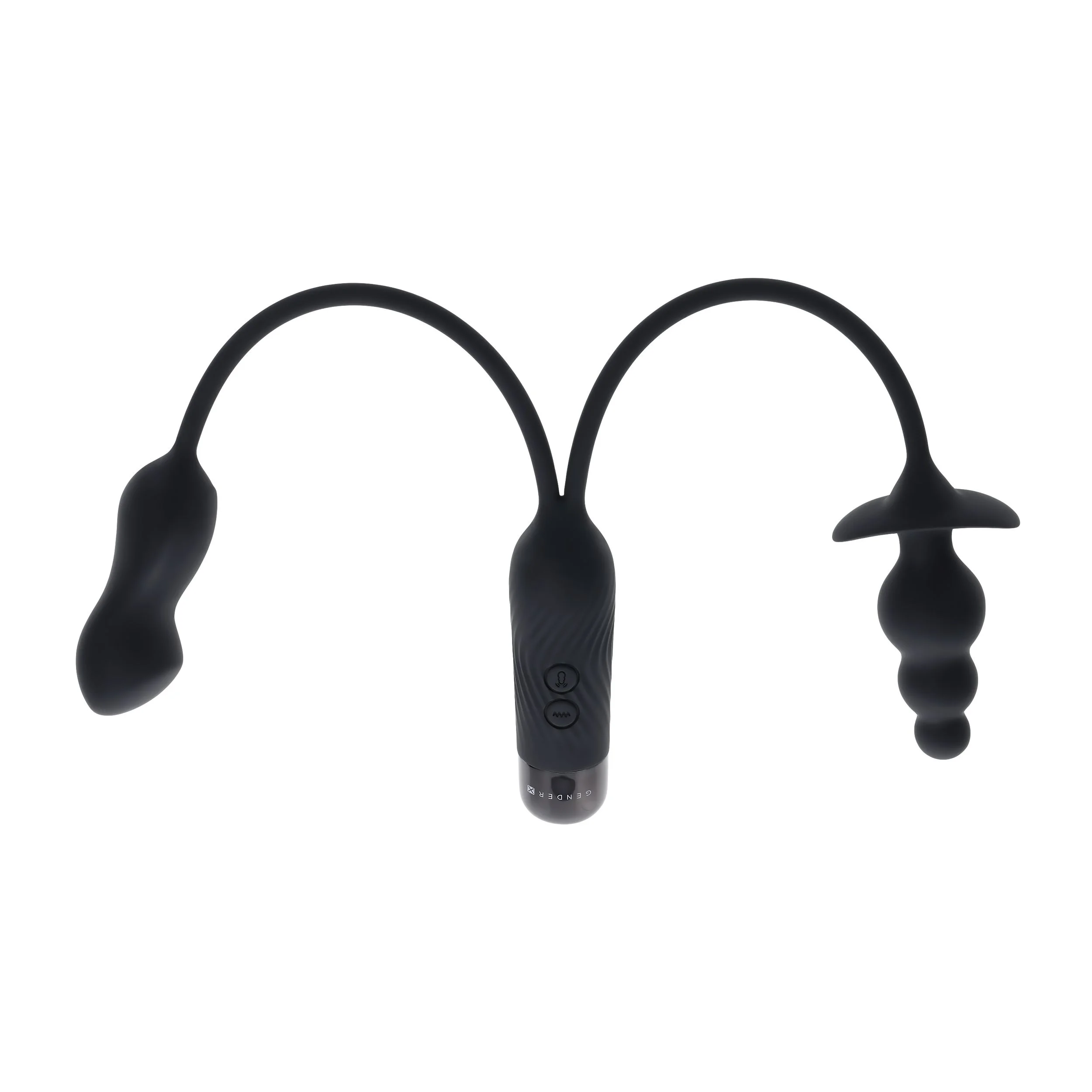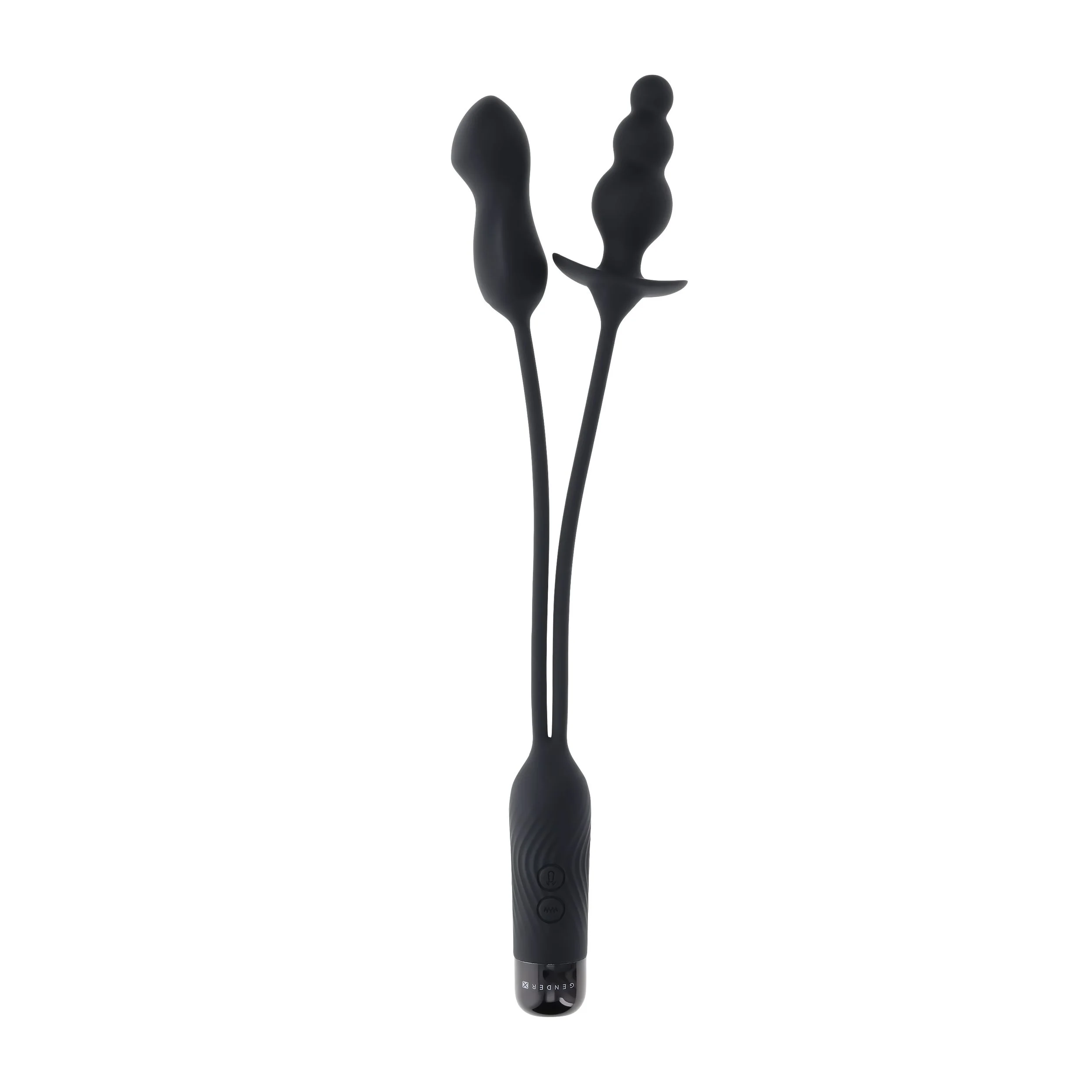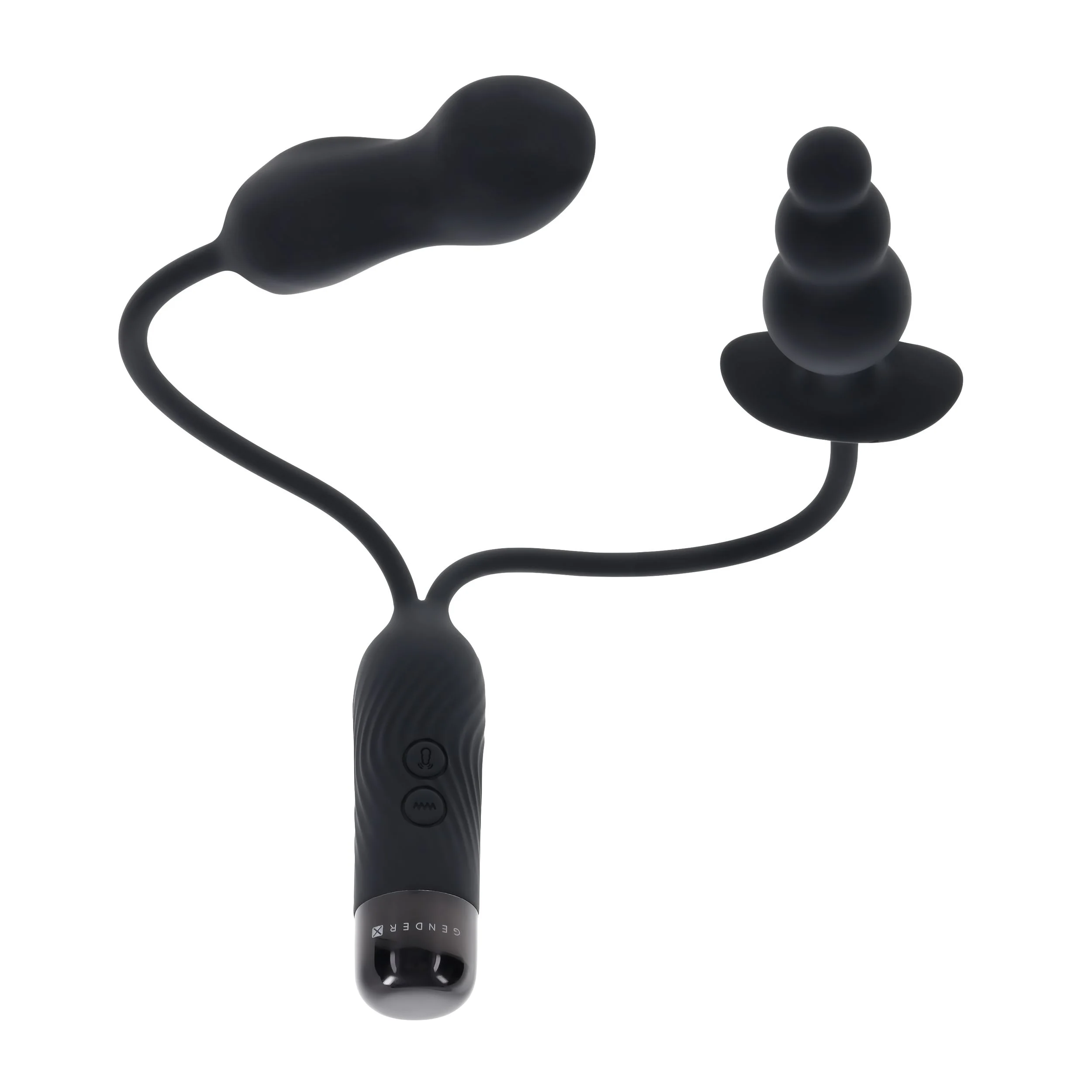 Deze toy met dubbele motor heeft twee vibrerende vormen – een buttplug en een mini-vibrator, elk verbonden door een flexibele kabel. De plug met ronde tip bestaat uit 3 bolletjes die geleidelijk groter worden naar een brede veiligheidsbasis. De dik gevormde mini-vibrator versmalt in het midden en eindigt met een afgevlakte, stompe punt. Een USB-plug is netjes opgeborgen onder de schroefdop van het getextureerde handvat. Vibrerend uiteinde: Inbrengbare lengte 8,30 cm Inbrengbare diameter 3,35 cm Plug uiteinde: Inbrengbare lengte 8 cm Inbrengbare diameter 3,30 cm