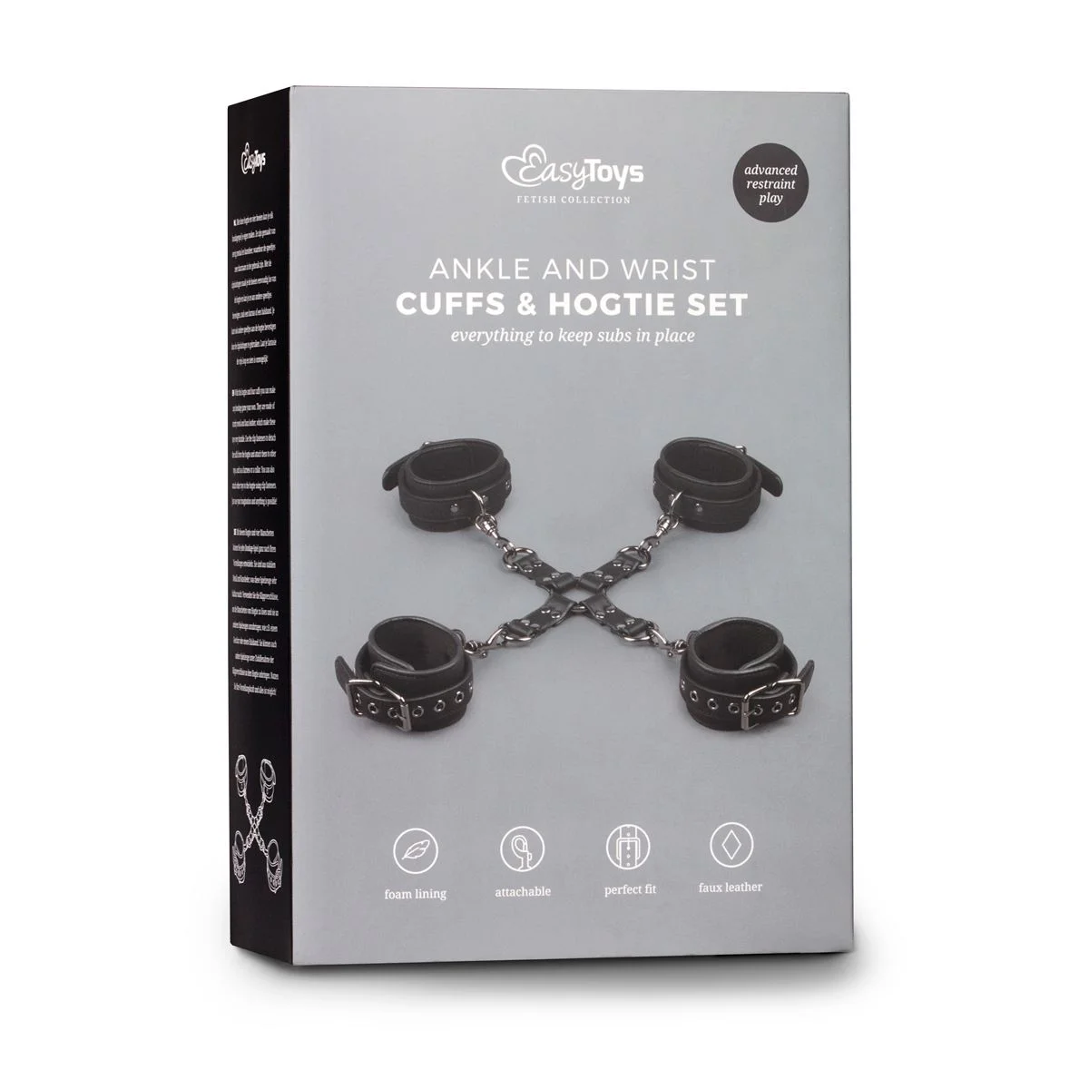 Completeer je bondagespel met deze leuke set. De set bestaat uit handboeien, enkelboeien en een hogtie die op iedere wenselijke manier gebruikt kan worden. De boeien zitten vast aan de hogtie met clipsluitingen zodat je ze makkelijk los kan maken en ze apart kan gebruiken of ze kan bevestigen aan andere bondagespeeltjes zoals harnassen of halsbanden. De boeien en hogtie zijn gemaakt van stevig kunstleer en metaal en zeer duurzaam. De boeien zijn verstelbaar voor een perfecte pasvorm en gevoerd met schuimrubber voor comfortabel gebruik.