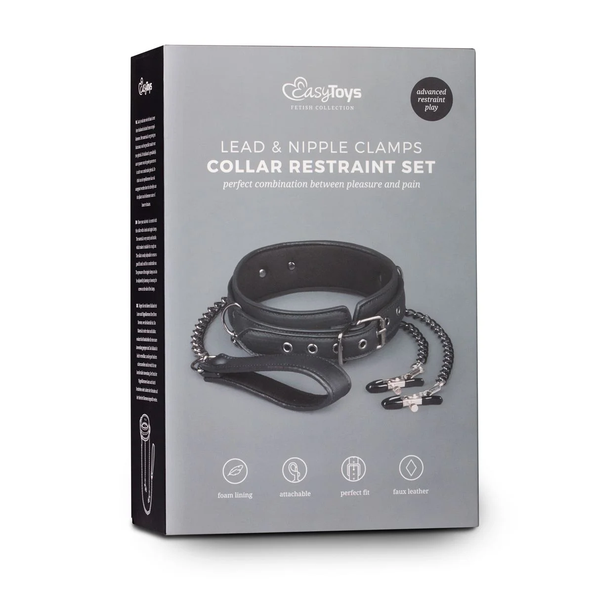 Met deze halsband inclusief tepelklemmen kan je je partner domineren en genieten van het gevoel van controle! De halsband is gemaakt van kunstleer, wat zorgt voor een luxe uitstraling. Hij is verstelbaar en zal dus altijd passen. De halsband en de klemmen zitten aan elkaar vast met metalen kettinkjes. Met deze halsband ben je verzekerd van een opwindend en sexy SM-spelletje. Lengte halsband: 60 cm