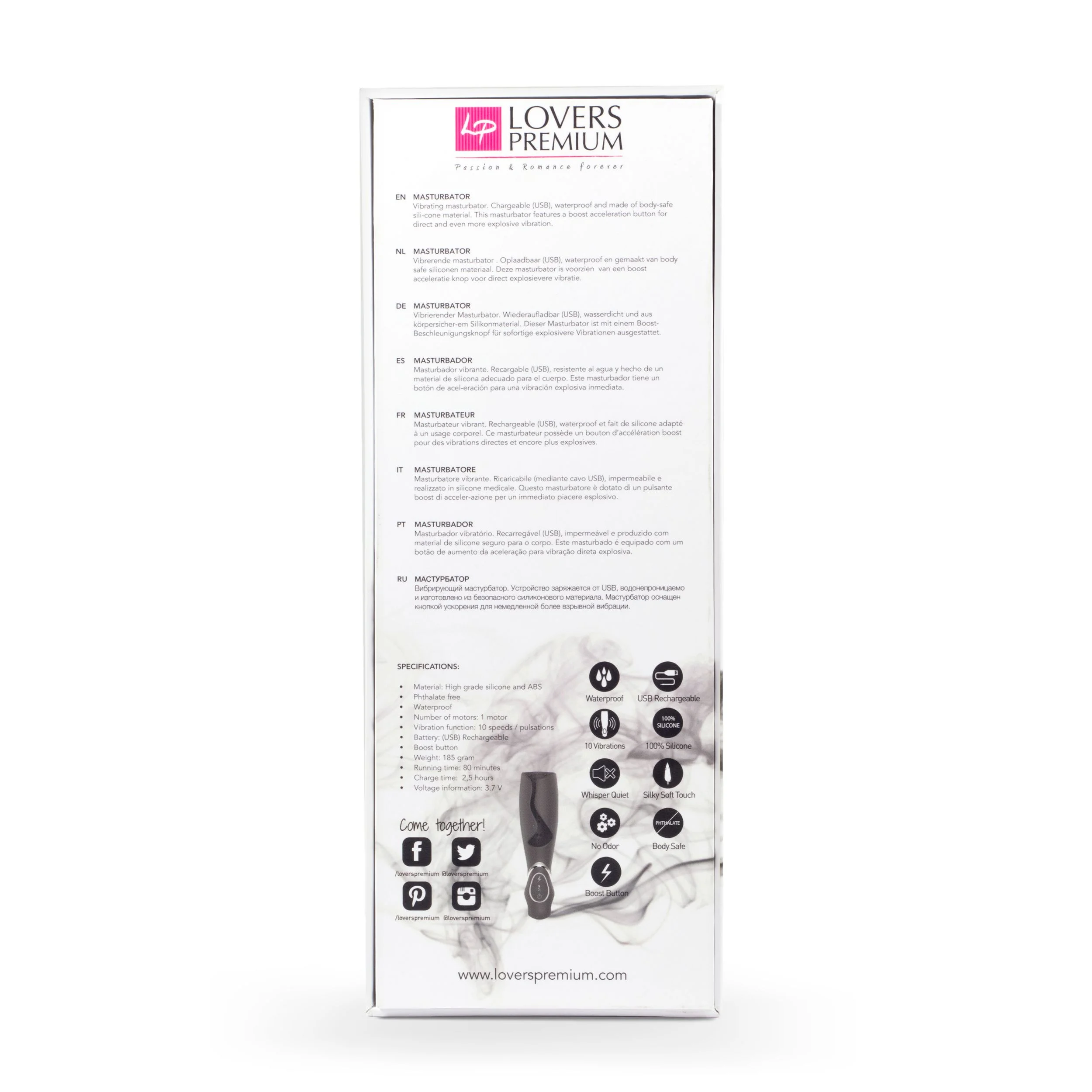 Vibrerende masturbator. USB oplaadbaar, waterproof en gemaakt van body safe siliconen materiaal. Deze masturbator is voorzien van een boost acceleratie knop voor direct explosievere vibratie.[MEER_INFO] Specificaties masturbator: - Materiaal: hoge kwaliteit siliconen en ABS - Vrij van ftalaten - 1 Fluisterstille motor - Number of whisper quiet motors: 1 - 10 Vibratie patronen en snelheden - Waterproof - Boost acceleratie knop - USB oplaadbaar - Gewicht: 185 gram - Gebruiksduur op volle batterij: 80 minuten - Oplaadtijd: 2,5 uur - Voltage: 3.7 V - Diameter: 4,3 cm