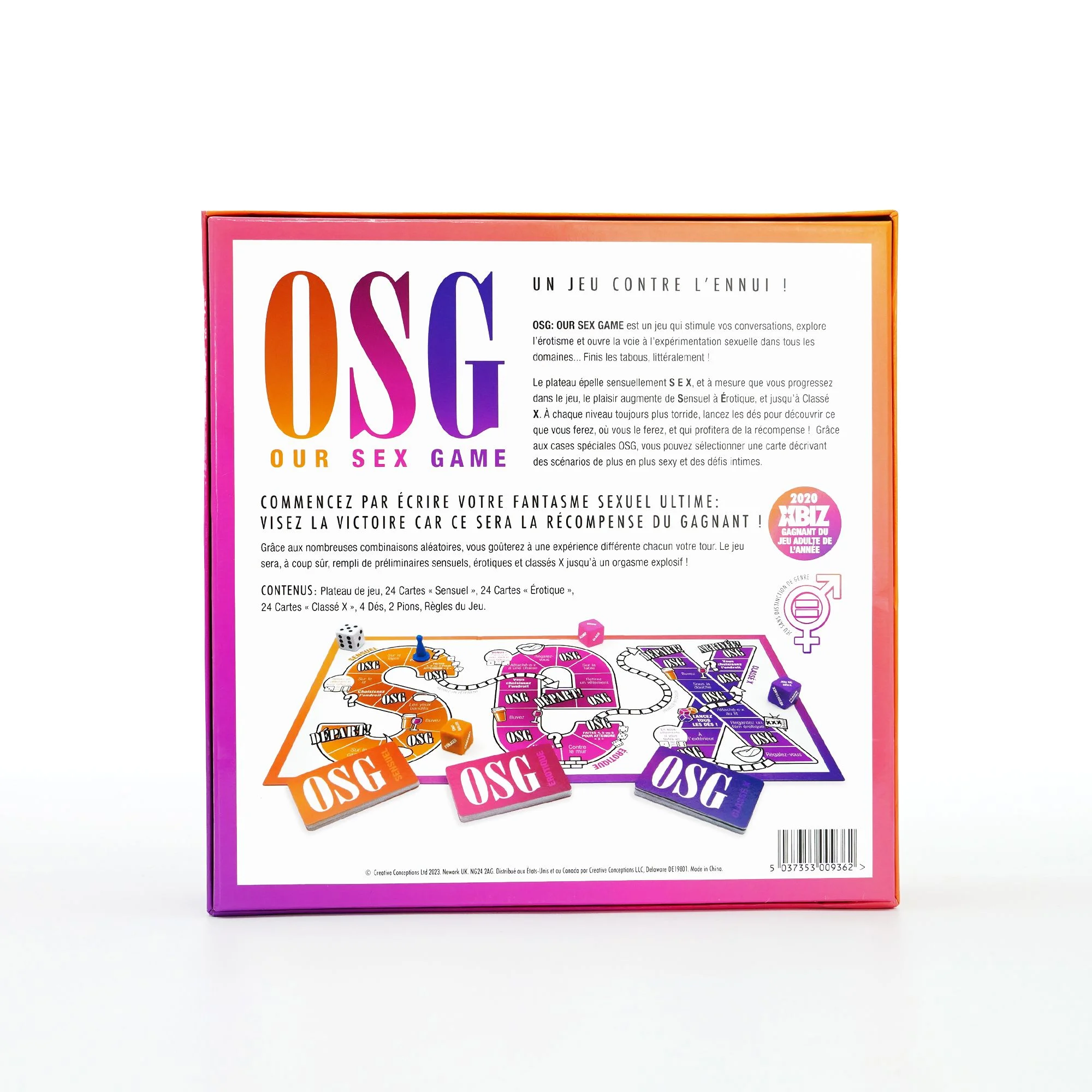OSG ''Our Sex Game'' is een spel waarin alles mogelijk is! Het moedigt stimulerende gesprekken, erotische verkenning en experimentatie aan, waarbij niets onaangeroerd blijft - letterlijk! Op een bord dat zwoel de letters S E X uitspelt, wordt het genot intenser naarmate je vordert van Verleidelijk naar Erotisch en uiteindelijk naar X-rated. Met elk steeds heter niveau, rol je de dobbelsteen om te ontdekken wat je gaat doen, waar je het gaat doen, en wie er van de beloningen geniet! Het bord is ook gevuld met OSG-vakjes waar je een kaart kiest die steeds spannendere scenario's en intieme acties beschrijft. Begin met het stiekem opschrijven van je ultieme seksuele fantasie: Speel om te winnen, want dit wordt de prijs voor de winnaar! De vele willekeurige combinaties zorgen ervoor dat jullie elke keer dat je speelt, een andere ervaring hebben. Wat je reis ook is - het zal zeker gevuld zijn met verleidelijke, erotische en X-rated voorspel, dat leidt tot een explosief hoogtepunt! OSG is een genderneutraal spel en dus voor iedereen toegankelijk!