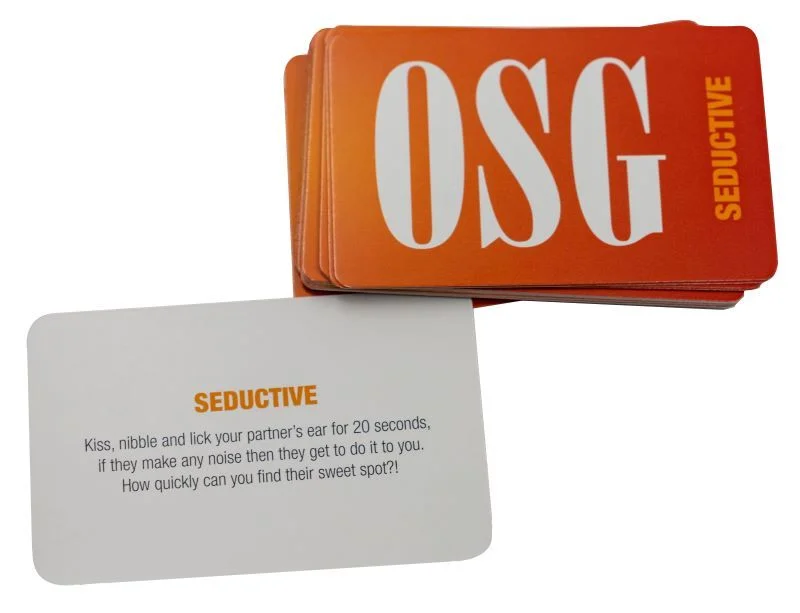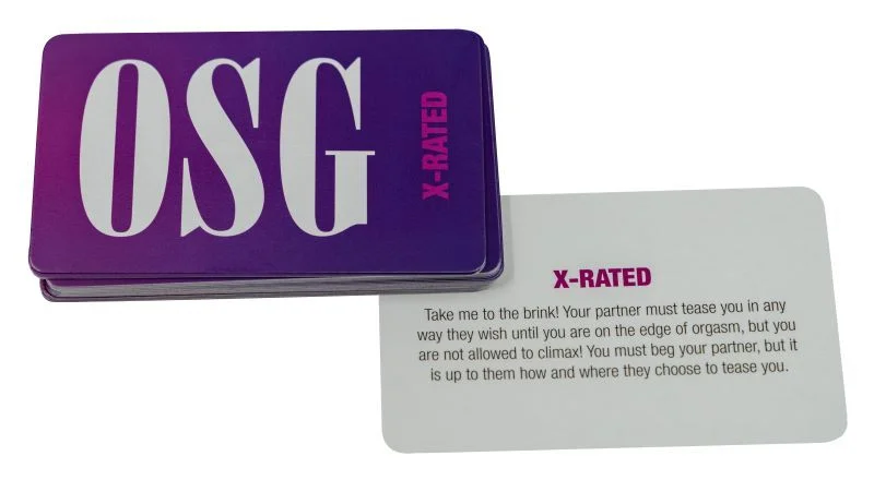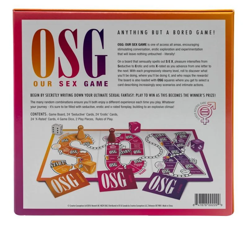 OSG ''Our Sex Game'' is een spel waarin alles mogelijk is! Het moedigt stimulerende gesprekken, erotische verkenning en experimentatie aan, waarbij niets onaangeroerd blijft - letterlijk! Op een bord dat zwoel de letters S E X uitspelt, wordt het genot intenser naarmate je vordert van Verleidelijk naar Erotisch en uiteindelijk naar X-rated. Met elk steeds heter niveau, rol je de dobbelsteen om te ontdekken wat je gaat doen, waar je het gaat doen, en wie er van de beloningen geniet! Het bord is ook gevuld met OSG-vakjes waar je een kaart kiest die steeds spannendere scenario's en intieme acties beschrijft. Begin met het stiekem opschrijven van je ultieme seksuele fantasie: Speel om te winnen, want dit wordt de prijs voor de winnaar! De vele willekeurige combinaties zorgen ervoor dat jullie elke keer dat je speelt, een andere ervaring hebben. Wat je reis ook is - het zal zeker gevuld zijn met verleidelijke, erotische en X-rated voorspel, dat leidt tot een explosief hoogtepunt! OSG is een genderneutraal spel en dus voor iedereen toegankelijk!  Het spel is alleen beschikbaar in het Engels.