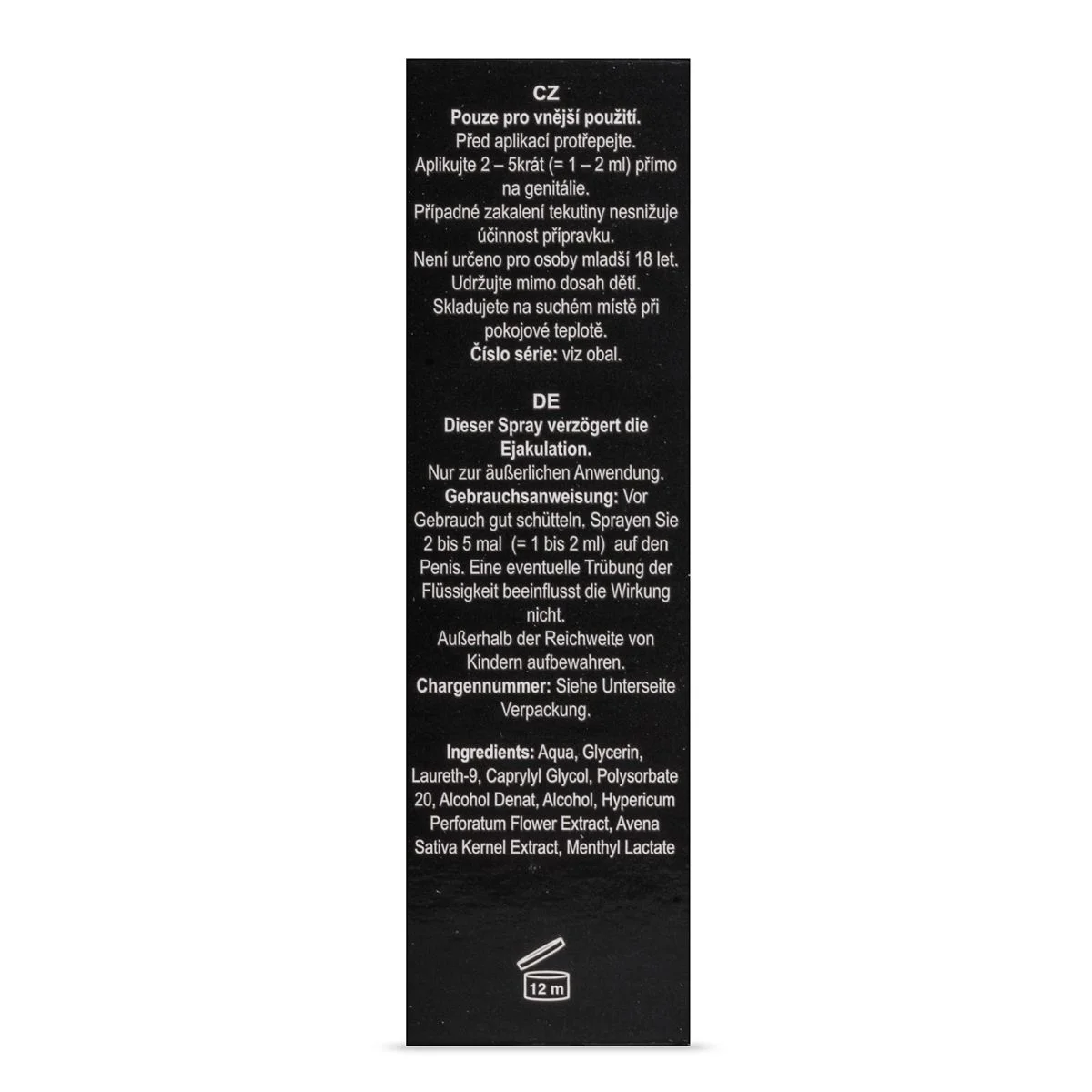 De orgasme vertragende spray van Black Stone geeft jou en je partner een ontspannende en bevredigende sekservaring. Met deze spray houd je een hardere erectie langer vast en verdoof je de gevoeligste plekken van je penis. Hiermee kom je minder snel tot het hoogtepunt en stel je het orgasme uit. Spuit de spray op je penis en laat het rustig intrekken. Je prikkels worden op een lager pitje gezet en het werkt kalmerend. Met deze spray genieten jij en je partner langer van de seks. Stop het gebruik bij roodheid, een branderig of een pijnlijk gevoel. Gebruik het product niet op een beschadigde huid. Het gewenste resultaat kan per persoon verschillen. Niet veilig te gebruiken met condoom. Ingrediënten: aqua, glycerin, laureth-9, alcohol denat., caprylyl glycol, avena sativa extract, hypericum perforatum extract, menthyl PCA