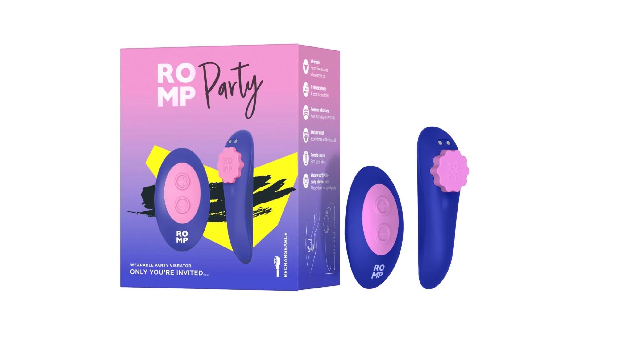 Maak van elk moment een sensationeel feestje met de ROMP Party – een krachtige en fluisterstille vibrator in panty-stijl die je moeiteloos en discreet onder je kleding kunt dragen. Of je nu relaxt op de bank, samen iets spannends onderneemt of onderweg bent, deze draagbare vibrator zorgt voor intens genot zonder dat iemand het merkt. De ROMP Party biedt 7 krachtige vibratiestanden die eenvoudig te bedienen zijn met de bijgeleverde draadloze afstandsbediening. Met een bereik van maar liefst 10 meter is het de perfecte partner voor solo-ontspanning of een ondeugend spel met je geliefde. Laat je verrassen door diepe vibraties die je precies daar raken waar je ze wilt – en dat allemaal zonder lawaai of gedoe. Het ergonomische ontwerp in comfortabel, lichaamsveilig siliconen voelt zijdezacht aan en blijft goed op z’n plek zitten, zelfs tijdens het dragen. Dankzij de IPX7-waterdichtheid geniet je er ook in bad of onder de douche van, en is reinigen zo gepiept. Met een gebruikstijd van 60 minuten en magnetisch opladen is de vibrator snel weer klaar voor gebruik. De afstandsbediening gaat tot wel 5 uur mee op één lading, zodat jullie niet midden in de spanning hoeven te pauzeren. ROMP staat bekend om kwalitatieve sekstoys die innovatie combineren met plezier, en de ROMP Party vibrator is daar hét speelse bewijs van. Discreet, reisvriendelijk en onweerstaanbaar opwindend – klaar voor je volgende geheime avontuur?