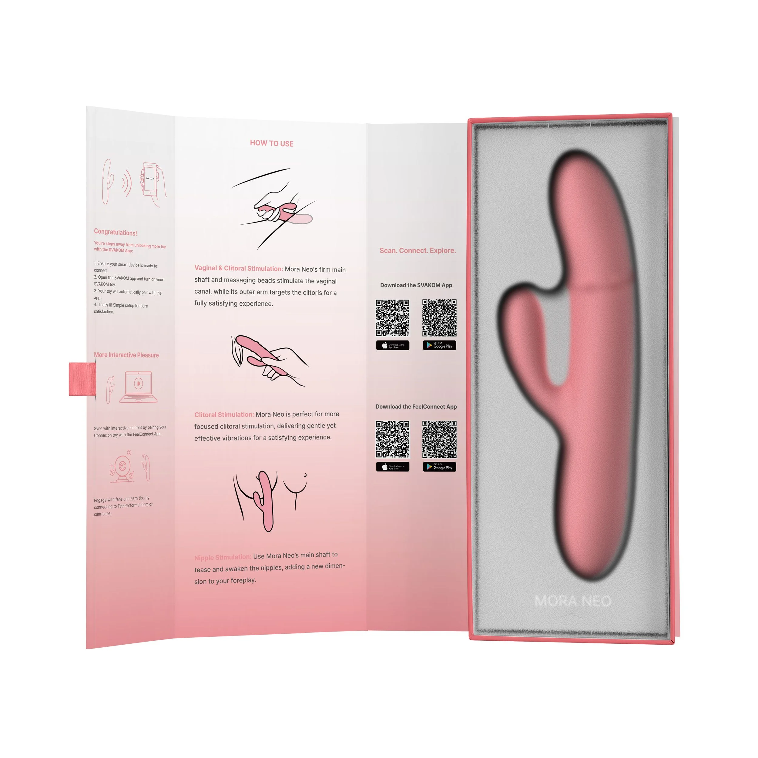 Je perfecte vibrator is er: de Mora Neo van SVAKOM! Deze interactieve vibrator is voorzien van innovatieve, stotende kralen. Gemaakt van zacht aanvoelende siliconen en voorzien van een stotende kralenring met een onafhankelijk bedienbare clitoris stimulator. Ontdek maar liefst 3 stootsnelheden, 5 vibratiestanden en 5 vibratiesnelheden. Daarnaast is de Mora Neo voorzien van een Bonus Intelligent Mode die het ritme van seks 4 minuten lang nabootst. Om toegang te krijgen tot meer instellingen kun je eenvoudig de SVAKOM App downloaden op je Android of Apple. Met de App ontdek je talloze mogelijkheden en zelfs een langeafstandsbediening tussen jou en je partner, waar ter wereld je ook bent! Mora Neo maakt deel uit van de Connexion-serie van SVAKOM en kan ook worden gebruikt voor interactieve video's of de webcam. Ontworpen voor gemak; Mora Neo is voorzien van een geheugenfunctie die doorgaat met de laatste vibratiemodus die is gebruikt en is daarnaast voorzien van een reisvergrendeling om onbedoelde inschakeling te voorkomen. De vibrator heeft een accu-indicator en een USB-oplaadpoort met stofkapje. Het design is waterdicht voor gebruik in bad of onder de douche en voor eenvoudige reiniging. Zeg ''ja'' tegen de ring en ontdek sensaties als nooit tevoren!